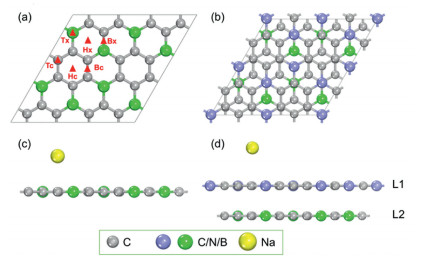 There are six favorable high-symmetry adsorption sites on the hexagonal monolayer or bilayer HTSs, as shown in Fig. 1a, labeled as top (T), bridge (B) and hollow (H) sites. When a Na atom adsorbs on the C3B or C3N layer as shown in Figs. 1c and d, each class of the adsorption sites (T, B, and H) could be further classified by its chemical environment. We use a subscript to denote this discrimination, for instance, HC denotes the hollow site of a carbon hexagonal, HX denotes the hollow site of the hexagonal composed by four carbon atoms and two X atoms, and BX denotes the bridge site of a chemical bond between a carbon and an X atom, where X can be N or B. The case would be much more complex when considering Na adsorption on HTSs. As shown in Fig. S1 (Supporting information), for Na adsorbed on the graphene side of the C3X/GR, denoted as Na@GR/C3X (X = B, N), there are three top sites, three bridge sites and two hollow sites. When Na is adsorbed on the C3X side of a HTS, either with a C3X or GR sublayer, there are four top sites, three bridge sites, and two hollow sites.