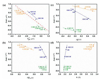 Figure 2.  Correlations between (a) the Na adsorption energies and the substrate p-band centers, (b) the electron loss of Na atom, (c) the interlayer charge transfer, (d) the heights of the adsorbed Na atom (the C—C bond lengths in the hexagonal ring with the hollow site occupied by the Na atom).