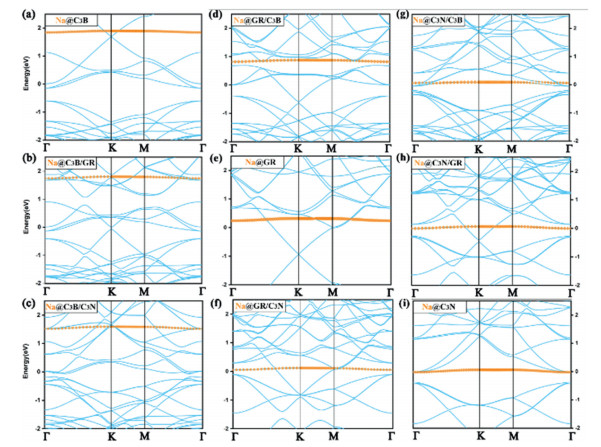 Figure 3  (a-i) Band structures of Na adsorbed on various substrates. The substrates are labeled as legends in each subfigure. The contribution of Na 3s states is denoted by orange dots with varying radii.