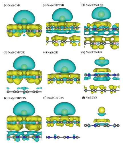 Recently, C3N and C3B monolayers, which are similar to graphene having a planar hexagonal structure material, have been synthesized experimentally and it is predicted that those materials may have potential applications as anode materials [1618]. It has been identified that heterostructures (HTSs) constructed by combining various 2D semiconductors can effectively engineer the electronic structures, and promising candidates for nanoscale electronic, photovoltaic and optoelectronic devices [1921]. Experimentally, various graphene based HTSs, such as graphene/MoS2 [22,23], MXene/graphene [24], borophene/graphene [25] and V2O5/graphene [26], have been successfully synthesized, showcasing enhanced properties for nanoelectronics and optoelectronics applications. These HTSs exhibit strong interlayer coupling through charge transfer, resulting in distinct optical and electronic properties. Furthermore, the in-plane stability of 2D HTSs is sustained by strong covalent or ionic interactions, while weak van der Waals (vdW) interactions maintain the interlayer stacking pattern. By tuning the interlayer electronic coupling, 2D HTSs can be endowed with attractive electronic properties. Motivated by these advantages, we have constructed a series of HTSs by stacking monolayers of C3N, C3B, and graphene, and investigated the impact of interlayer charge transfer on their electronic structures. Additionally, we have assessed the adsorption of sodium on these HTSs to evaluate their potential as anode materials and provide insights for performance improvement. The binding of sodium atoms on 2D HTSs involves significant charge transfer [27], making it highly influenced by the chemical reactivity of the substrate. The stability of sodium adsorption is primarily determined by the substrate to which the sodium atom directly binds, and can be further adjusted through interlayer charge transfer.