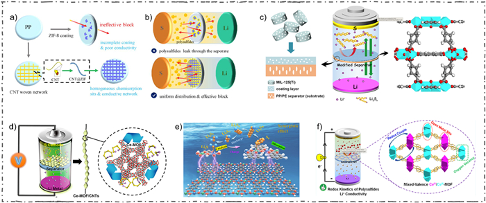 Figure 1 Schematic of (a) ZIF-8, the CNT@ZIF-8 composites modified separators and (b) their assembled batteries. Reprinted with permission [30]. Copyright 2018, Elsevier Inc. (c) Schematic of the battery with MIL-125(Ti)-modified separator. Reprinted with permission [31]. Copyright 2020, American Chemical Society. (d) Illustration of Co-MOF/CNTs composite separators to catalysis the polysulfides. Reprinted with permission [33]. Copyright 2019, American Chemical Society. (e) Schematic of separator for Li–S battery. Reprinted with permission [34]. Copyright 2023, Elsevier Inc. (f) Schematic of the CSUST-1/CNT composite separator for high performance LSBs. Reprinted with permission [35]. Copyright 2021, American Chemical Society.