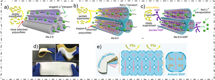 Figure 2. Schematic mechanism of the effection of (a) Ms-2.9, (b) Ms-9.0 and (c) Ms-9.0-NSP on the diffusion of polysulfides and Li+. Reprinted with permission [36]. Copyright 2020, Elsevier Inc. (d) Photographs of the nano-porous separator. (e) Schematic of the nano-porous separator for inhibiting Li dendrite growth and polysulfide shuttling. Reprinted with permission [37]. Copyright 2020, Wiley-VCH.Wang et al. developed a flexible free-standing MOF-based separators by using anionic UiO-66-SO3Li [37]. The MOFs pore structure was modified by incorporating numerous of sulfonic acid anionic groups (SO3–), which effectively and accurately regulated the Li+ flux and obtained uniform Li+ deposition. The pore structure of UiO-66-SO3Li is formed by connecting Zr6O4(OH)4 clusters and 2,5-dicarboxybenzene sulfonate (BDC-SO3-) with a uniform size of approximately 0.6 nm, the pore size is significantly smaller than the soluble polysulfide (Sn2−, 4 < n ≤ 8). Consequently, these modified pores exhibited an anion electrostatic repulsion and size sieving effect, which overtly inhibit the polysulfide shuttling and accelerate the electrode redox activity (Figs. 2d and e). During the first 100 cycles, the capacity decay rate of LSBs with the MOF-based separator is only 0.26% per cycle, which is just about half of the LSBs with a PP separator (0.47% per cycle).