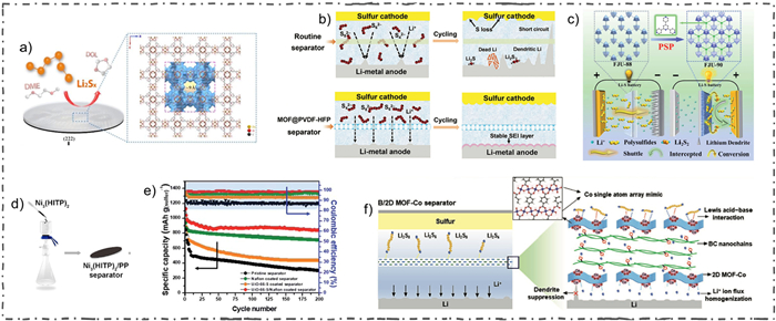 Guo et al. synthesized a MOF composite separator by using domain-limited in situ growth method [51]. Copper hydroxide nanowires (CHN) were used as the metal source, the negatively charged PSS and positively charged CHN were homogeneously mixed firstly, and then filter the mixture on the Celgard 2400 separator, called PSS@CHNs. The PSS@CHNs separators were then immersed into the H3BTC solution, an in situ reaction occurred as a predictable result, called PSS@HKUST-1 separator (Fig. 6d). The three-dimensional PSS network contains a large number of sulfonic acid groups that significantly promote Li+ transport and ensure fast electrochemical reaction kinetics. Additionally, the MOF separator's pore size structure and large number of sulfonic acid groups provide the electrostatic repulsion and ion sieving effects, effectively inhibiting the shuttling of polysulfides. The reversible capacity maintained about 75% after 500 cycles at 0.5 C.