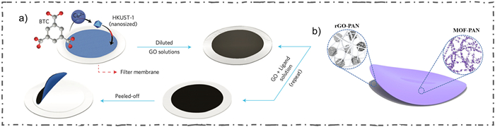 Graphene oxide has excellent mechanical properties and it is easily to be prepared on a large scale, exhibiting good potential application as a substrate for MOF-based separator. Bai et al. grew a MOF-199-based composite layer in situ on the surface of a membrane by repeat filtering the MOF-199 precursor solution and diluted graphene oxide (GO) solution [46]. The lamellar GO layer is regularly covered on top of the MOFs layer, and then peeled it off from the filter membrane to obtain MOF@GO separator (Fig. 5a). The prepared separator showed an excellent ion sieving effect and inhibited the shuttling effect. The batteries with the prepared separator achieved an initial discharge capacity of 1126 mAh/g at 0.5 C, and the capacity retention rate is about 71% during 1500 ultra-long cycles at 1 C.