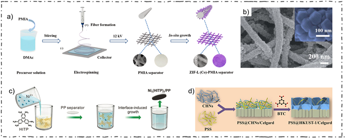 Figure 6 (a) Illustration of the preparation process of the Z-PMIA separator. Reprinted with permission [48]. Copyright 2021, Elsevier Inc. (b) SEM images of the P- PMIA@ZIF-8 separator. Reprinted with permission [49]. Copyright 2022, Royal Society of Chemistry. (c) Schematic illustration of preparation process for the conductive Ni3(HITP)2-based separator. Reprinted with permission [50]. Copyright 2018, Wiley-VCH. (d) Schematic of the preparation process for PSS@HKSUT-1-based separator. Reprinted with permission [51]. Copyright 2018, American Chemical Society.