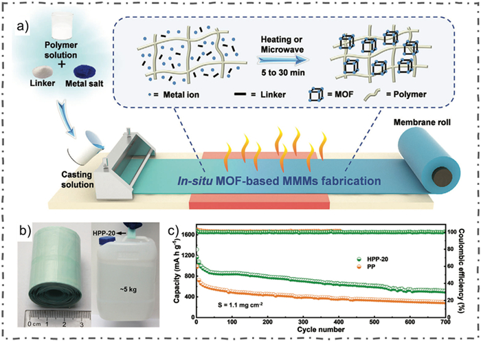 Mass production of MOF-based functionalized separators still remains an insurmountable challenge, Gao and his team proposed a in situ heat-assisted solvent-evaporation (HASE) method to produce MOF-based separators in industrial-level efficiency [52]. The separator was fabricated by casting the mixture of MOF (i.e., HKUST-1, UiO-66) precursors with polymers (i.e., PVC, PP, PVDF) in solvent firstly, and meanwhile, through the well-controlled temperature synthesis process, a uniformed and robust separator was obtained finally (Figs. 7a and b). The Li-S batteries with the functionalized separator exhibited an initial discharge capacity of 1163.7 mAh/g and remained about 500 mAh/g after 700 cycles at the current density of 0.5 C (Fig. 7c). This massively fabrication method of MOF-based separator might promote the potential commercialization process of MOF-based separator for the future.