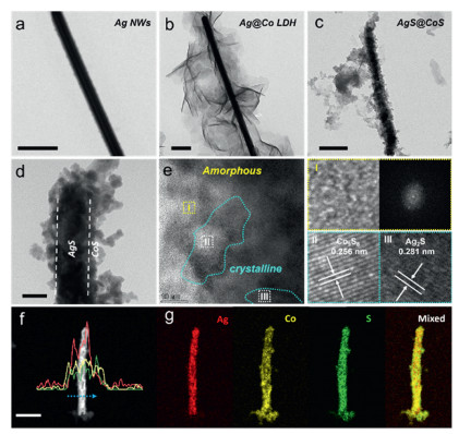 Figure 1  TEM images of (a) Ag NWs, (b) Ag@Co LDHs, and (c) AgS@CoS catalysts. (d, e) HRTEM images and (Ⅰ, Ⅱ, and Ⅲ) corresponding amplified HRTEM images in the selected regions, (f) line-scan profile and (g) corresponding mapping images of AgS@CoS catalysts. The scale bar for (a-d), and (f) are 200, 200, 200, 50, and 200 nm, respectively.
