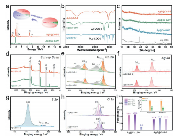 Figure 2.  (a) EDS spectrum of Ag@Co LDHs and AgS@CoS-2 catalysts. (b) FT-IR spectra of Ag@ZIF-67, Ag@Co LDHs, and AgS@CoS. (c) XRD patterns of Ag NWs, Ag@ZIF-67, Ag@Co LDHs, and AgS@CoS. XPS spectra of (d) survey scan, (e) Co 2p, (f) Ag 3d, (g) S 2p, (h) O 1s and (i) relative content of O and Co species in AgS@CoS catalysts.