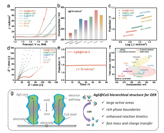 Figure 3  (a) LSV curves, (b) overpotential comparison, (c) Tafel slopes, (d) EIS plots, (e) the CP curve at 10 mA/cm2. (f) OER catalytic properties of the reported catalysts. (g) The schematic image of AgS@CoS catalysts with superior catalytic property.