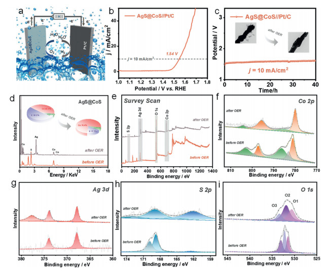 Figure 4.  (a) Schematic image of AgS@CoS-2//Pt/C electrode couple. (b) LSV curve and (c) long-term stability of CP test of AgS@CoS-2//Pt/C at current density of 10 mA/cm2 with the inserted TEM images of AgS@CoS catalysts before and after OER process. (d) EDS spectrum, (e) XPS survey scan, (f) Co 2p, (g) Ag 3d, (h) S 2p, and (i) O 1s spectra of AgS@CoS catalysts before and after OER tests.