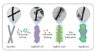 The synthetic process of AgS@CoS catalysts was shown in Scheme 1. The one-dimensional (1D) Ag NWs were prepared. Then, the ZIF-67 crystals were obtained under the existence of Ag NWs to fabricate the Ag@ZIF-67 catalysts. Soon afterwards, the Ag@ZIF-67 catalysts were converted into the Ag@Co LDHs by in-situ ion etching process. In specific, the protons oriented from the Co(NO3)2 in ethanol solution could etch the ZIF-67 crystals to release both Co2+ and Co3+, which could be oxidized into the Co3+ by the NO3 and the dissolved O species [33]. The coprecipitation could promote the nucleation and growth of Co LDHs on the surface of Ag@ZIF-67 catalysts to form the Ag@Co LDHs catalysts. Finally, the AgS@CoS catalysts were obtained by a wet-chemical vulcanization [34]. Notably, both the inner Ag NWs and outer Co LDHs have been converted into the AgS and CoS species with coarse surfaces, respectively.