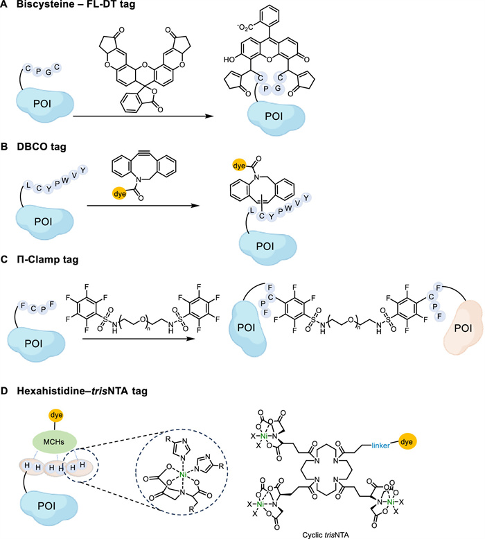 Figure 1.  Self-labeling peptide tags. (A) Biscysteine-FL-DT tag. (B) DBCO tag. (C) π-clamp tag. (D) Hexahistidine-trisNTA tag.