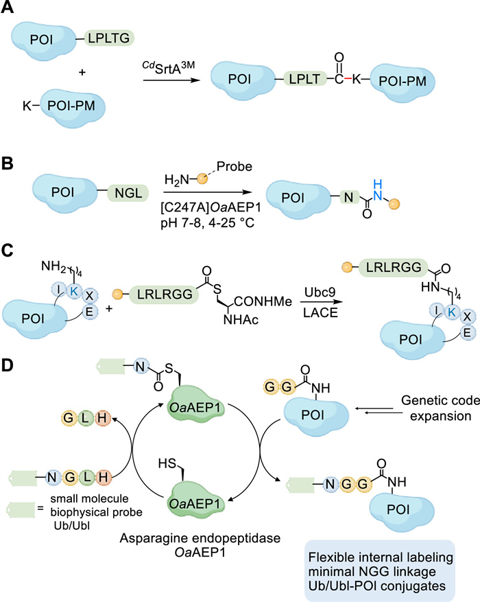 Figure 2.  Examples of labeling methods based on enzyme-mediated peptide-labeling tags. (A) Strategy for linking peptides to proteins via formation of a specific Lys-isopeptide bond using CdSrtA3M. (B) Strategy for utilizing engineered OaAEP1 [C247A] to irreversibly incorporate diverse, commercially available amines at C-terminal asparagines. (C) Strategy for involving LACE to site-specifically label folded proteins at internal Lys residues. (D) Strategy for using OaAEP1 to site-specifically label target proteins with an isopeptide-linked glycylglycine moiety.