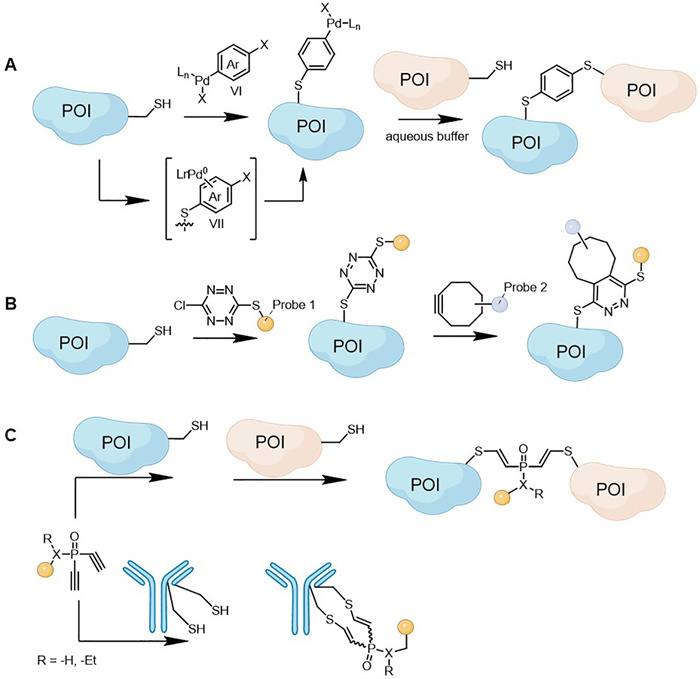 Figure 3  Site-specific Cys labeling methods. (A) Cys labeling via palladium-protein OAC. (B) General method for dual labeling of protein Cys residues with chlorotetrazines. (C) Substituted diethynyl phosphinates as reagents for selective thiol–thiol bioconjugation and rebridging of native disulfides and application to forming therapeutic antibodies.