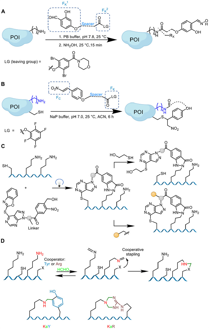 Figure 4  Representative site-specific Lys labeling methods. (A) Labeling of a single Lys using LDMK-K technology. Rx indicates the labels from oxime derivative of the LDM reagent and x varies as per the LDM reagent. (B) Labeling of a single Lys using LDMC-K technology. (C) Strategy for Cys-directed Lys site-selective stapling and single-site labeling. (D) Strategy for stapling at Lys and Tyr or Arg with formaldehyde.