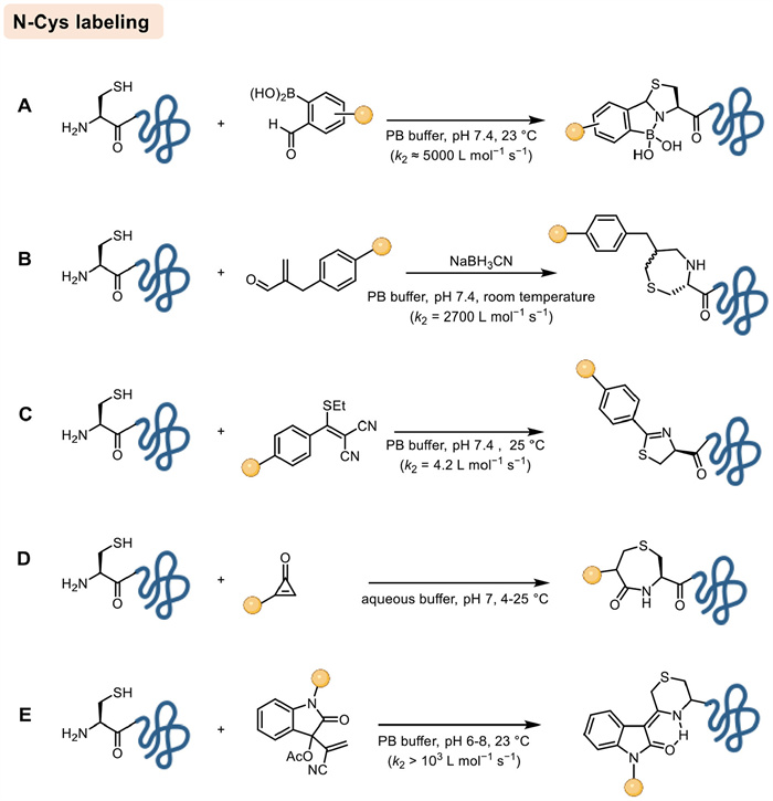 Figure 5  Strategies for selective labeling the N-terminal positions of proteins. N-Cys labeling via (A) 2-FPBA, (B) BAA, (C) TAMM, (D) CPO, (E) IBH.