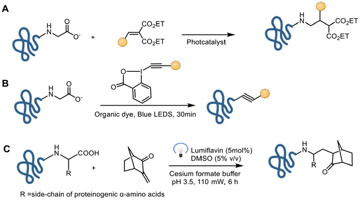 Figure 6  Strategies for selected labeling C-terminal positions of proteins. (A) C-terminus labeling via visible-light-mediated single-electron transfer. (B) C-terminus labeling via photoredox-catalyzed decarboxylative alkynylation using ethynylbenziodoxolone (EBX) reagents. (C) C-terminus labeling via photoredox-catalyzed decarboxylative alkynylation using NB reagents.
