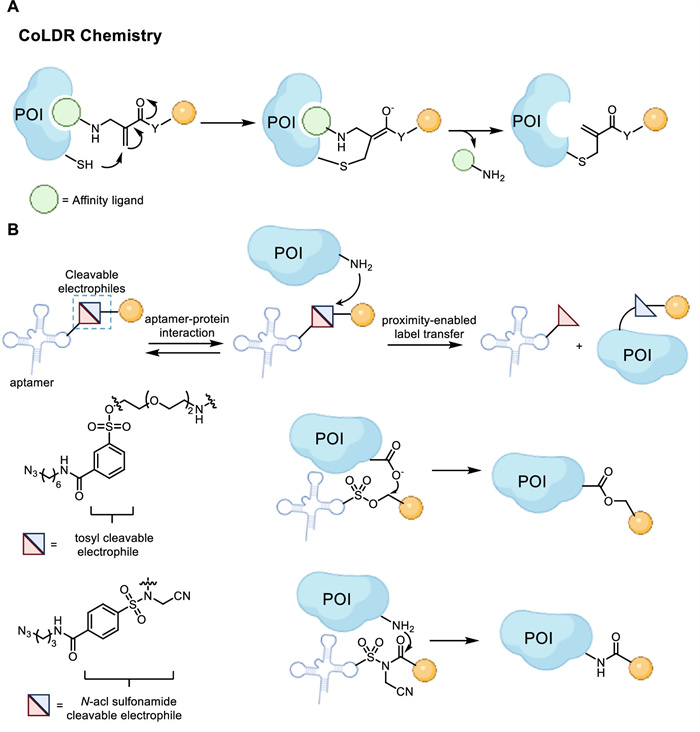 Figure 7  Site specific protein labeling through affinity-driven and ligand directed methods. (A) Schematic representation of the reaction of a target Cys with a substituted α-methacrylamide through CoLDR chemistry. (B) Schematic representation of aptamers modified with cleavable electrophiles that provide transfer of chemical motifs to a protein.