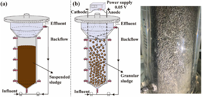 • The overuse of non-renewable fossil energy sources has caused serious environmental problems, and renewable energy sources access is necessary and urgent [1, 2]. One of the most challenging environmental issues is the waste biomass treatment, as it is necessary to meet environmental protection requirements and achieve the carbon emissions reduction at the same time [3, 4]. Medium-chain fatty acids (MCFAs) are renewable biochemicals that can be obtained from biomass by carbon chain elongation (CE) [5, 6]. MCFAs have multiple uses, that can be utilized as biochemical substitutes for traditional fossil fuels, thus contributing to sustainable development [7]. However, the production process of MCFAs is restricted by numerous limitations, such as the inhibition of microorganisms by the biotoxicity of MCFAs as their carbon chains are extended, and the low production efficiency of traditional anaerobic biotechnology [8]. Granularization of sludge microorganisms to form granular sludges is considered a suitable facilitator because granular sludges can help microorganisms to resist the toxicity of MCFAs and can improve the microbial function activity [9]. Nevertheless, how to promote sludge granulation remains a problem. Electric field (EF) has been widely used to promote aerobic granular sludge granulation [10, 11], but whether EF can be used to promote the granulation process of anaerobic granular sludge (AnGS) remains less studied. Our previous study [12] demonstrated that EF can enhance the CE process by up-regulating the abundance of key functional genes, and if EF can promote sludge granulation and the CE process simultaneously, this would likely increase the MCFAs yields to a greater extent. Therefore, in this study, we operated two continuous fed Expanded Granular Sludge Bed (EGSB) bioreactors, one with EF and one without, to demonstrate the promotion of sludge granulation by EF and the enhancement of MCFAs production efficiency by the AnGS.