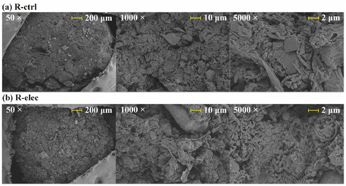 In order to further investigate the mechanisms by which EF promote the formation of AnGS, we performed SEM detection on the AnGS formed in two reactors. As shown in Fig. 3, from the 50× and 1000× images, the morphology of the AnGS in two reactors did not differ much, except that there appeared to be more pores in the AnGS in the R-elec. And when the magnification was 5000×, some differences were observed, there seemed to be more microorganisms in the AnGS formed in the R-elec, mostly rod-shaped microorganisms, which might be the most suitable microorganisms for MCFAs production [4, 14]. Whereas in the AnGS in R-ctrl, some rod-shaped microorganisms were also observed, but not as many as in R-elec. SEM detection demonstrated that the EF promoted AnGS formation possibly by enhancing the aggregation of CE microorganisms, which enables particles to form more conveniently. And the tiny pores formed in the AnGS may be more favorable for microorganisms to carry out behaviors such as transmembrane transport of metabolic intermediates [12].