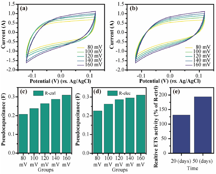 Figure 4.  CV of the AnGS in R-ctrl (a) and in R-elec (b). The pseudocapacitance in R-ctrl (c) and in R-elec (d). (e) Relative ETS activity was calculated based on R-ctrl on day 20 and day 50, respectively.