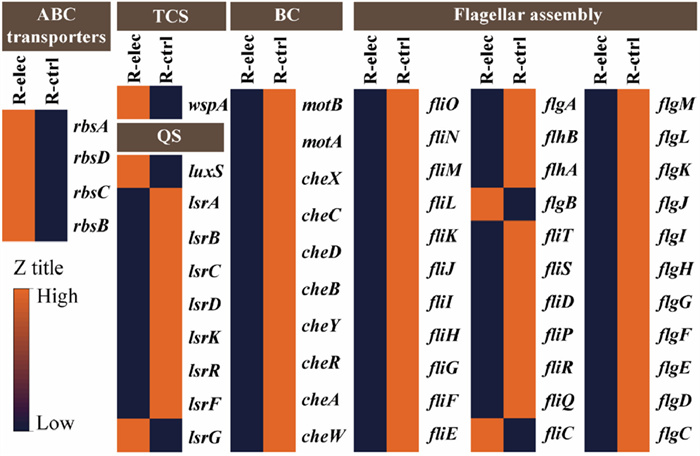 Figure 6  Changes in microbial community functions in R-ctrl and R-elec. TCS: two-component system, QS: quorum sensing, BC: bacterial chemotaxis.
