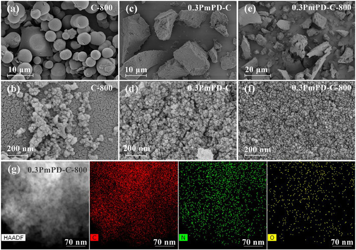 Figure 1.  SEM images of (a, b) C-800, (c, d) 0.3PmPD-C, (e, f) 0.3PmPD-C-800 catalysts. (g) The HAADF-mapping images of 0.3PmPD-C-800 catalyst.