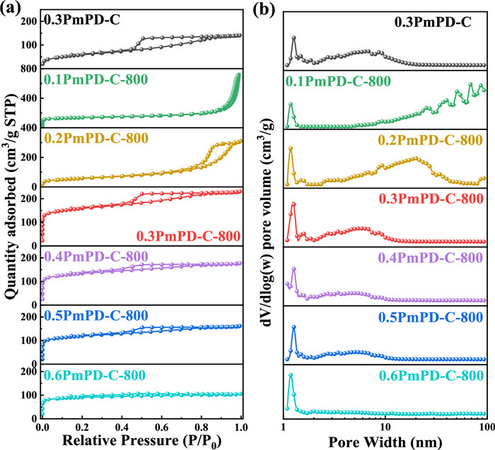 Figure 2.  (a) The adsorption/desorption isotherm and (b) the pore size distribution of 0.3PmPD-C and xPmPD-C-800 catalysts.