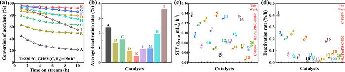 Figure 3  (a) The C2H2 conversion and (b) deactivation rates of C-800 (A), 0.3PmPD-C (B) and xPmPD-C-800 (C-I) catalysts. (c) The STY and (d) deactivation rates of the C-800 and 0.3PmPD-C-800 catalysts and other catalysts reported in 220 ℃.
