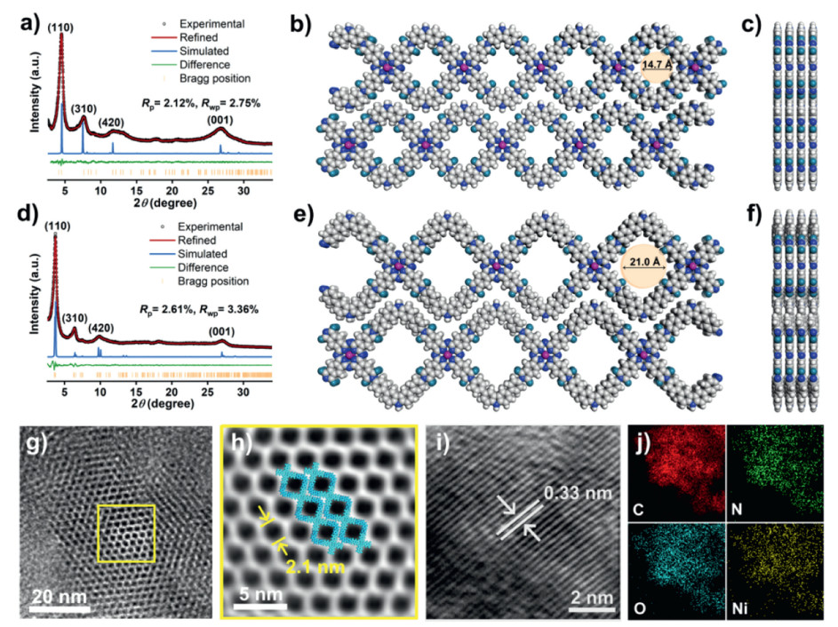Figure 1  PXRD patterns of (a) NiPc-CZDM-COF and (d) NiPc-CZDL-COF. Simulated structures of (b, c) NiPc-CZDM-COF and (e, f) NiPc-CZDL-COF (C: grey; N: blue; O: cyan; Ni: pink; H: white). (g-i) HRTEM images of NiPc-CZDL-COF. (j) EDS mapping photos of NiPc-CZDL-COF.
