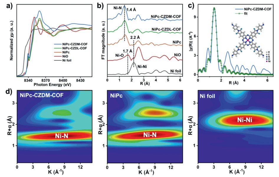 Figure 2.  (a) Ni K-edge XANES and (b) FT-EXAFS spectra of NiPc-CZDM-COF, NiPc-CZDL-COF, NiPc, NiO and Ni foil. (c) EXAFS fitting curves of Ni for NiPc-CZDM-COF. Inset: partial schematic structure of NiPc-CZDM-COF. (d) WT-EXAFS plots for Ni element of NiPc-CZDM-COF, NiPc and Ni foil.