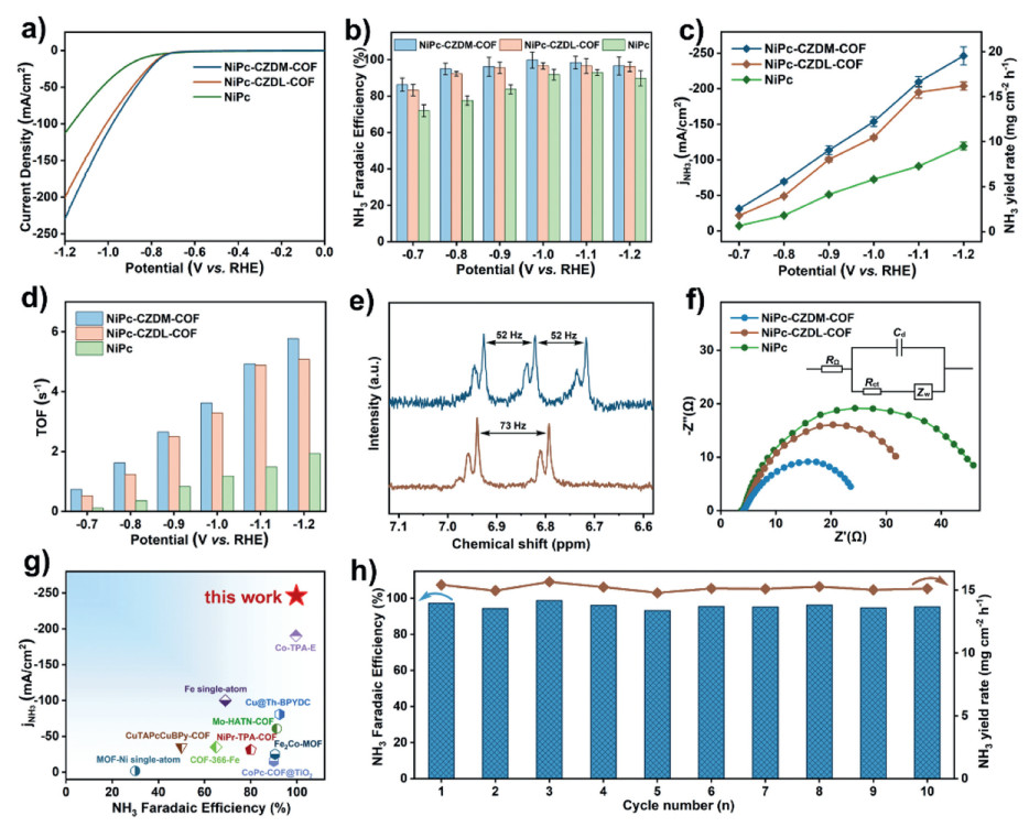 Figure 3.  (a) LSV curves, (b) FENH3, (c) jNH3 and NH3 yield rate, (d) TOF of the two COF and NiPc. (e) 1H NMR spectra of electrolyte after using K14NO3 and K15NO3 as the nitrogen source. (f) Nyquist plots of NiPc-CZDM-COF, NiPc-CZDL-COF and NiPc. (g) Comparison of FENH3 and jNH3 with other reported catalysts. (h) Cyclic electrocatalytic test of NiPc-CZDM-COF.