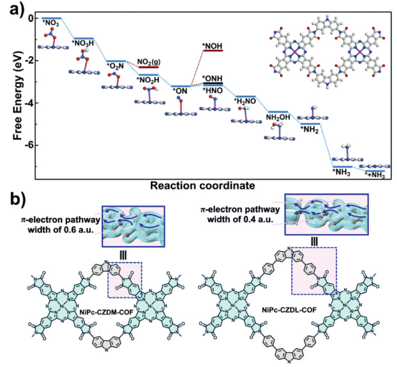 Figure 4.  (a) Energy pathway towards the NO3RR for NiPc-CZDM-COF. (b) The π-electron pathways of NiPc-CZDM-COF and NiPc-CZDL-COF evaluated by the π-Mayer bond order theory.