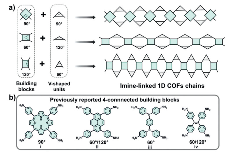Scheme 1.  Schematic structures of (a) building blocks, V-shaped linking units, and (b) topological structures of 1D imine-linked COFs reported thus far.