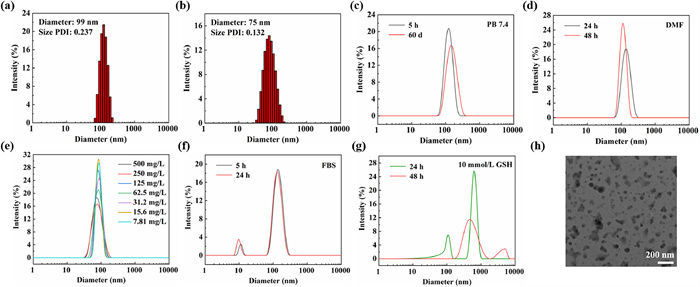 Figure 1.  Histogram of particle size distribution of (a) NCCL-CUR NPs and (b) CPT@NCCL-CUR NPs in PB 7.4 solution. Size distribution carves of CPT@NCCL-CUR NPs in different conditions: (c) in PB 7.4 solution, (d) in DMF, (e) in PB 7.4 solution with different concentrations of CPT@NCCL-CUR NPs, (f) in PB 7.4 solution containing 10% FBS, (g) in PB 7.4 solution plus 10 mmol/L GSH. (h) TEM image of CPT@NCCL-CUR NPs in PB 7.4 solution with 10 mmol/L GSH after stirring for 48 h (scale bar: 200 nm).