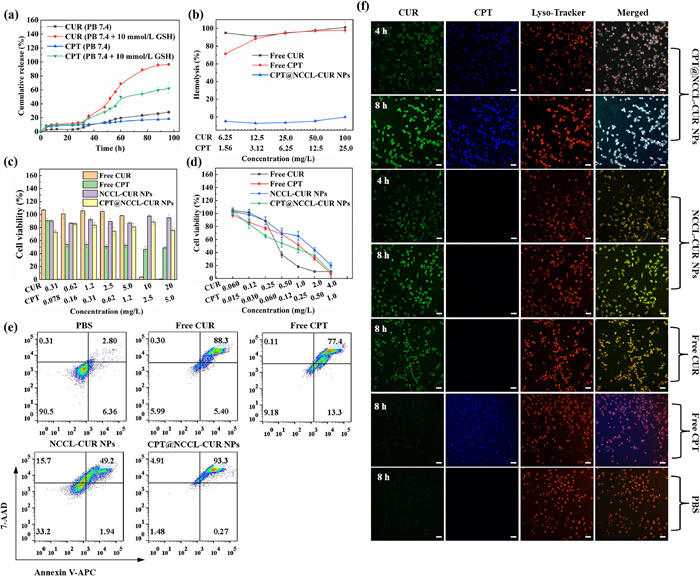 Drugs have the potential to cause damage to red blood cells when they enter the bloodstream, so spectrophotometric methods were used to test the degree of breakage of red blood cells after incubation with free CUR, free CPT and CPT@NCCL-CUR NPs, respectively. Fig. S10 (Supporting information) is a photo of three sets of blood compatibility test. It can be intuitively seen that compared with the control groups, the CPT@NCCL-CUR NPs group showed no significant hemolysis, and most red blood cells were concentrated at the bottom of the centrifuge tubes. Using Milli-Q water as the positive control group and phosphate buffered saline (PBS) as the negative control group, the hemolysis rate can be obtained. As shown in Fig. 2b, the hemolysis rate of CPT@NCCL-CUR NPs remained around 0 even at high concentrations, while both free CUR and free CPT showed high hemolysis at the same concentration, indicating that the dual-drug-loaded CPT@NCCL-CUR NPs greatly improved the hemocompatibility of original CUR and CPT.