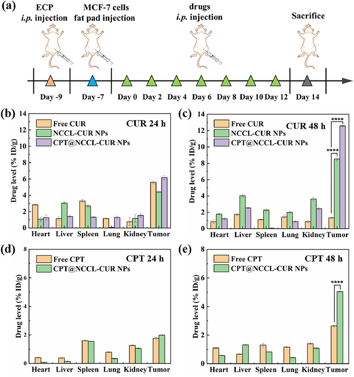 Figure 3  (a) Schematic diagram of in vivo tumor growth inhibition experiment. Distribution of CUR in tumors and tissues of major organs of mice after (b) 24 h and (c) 48 h of treatment. Distribution of CPT in tumors and tissues of major organs of mice after (d) 24 h and (e) 48 h of treatment. Data are presented as mean ± SD (n = 5). ****P < 0.0001.