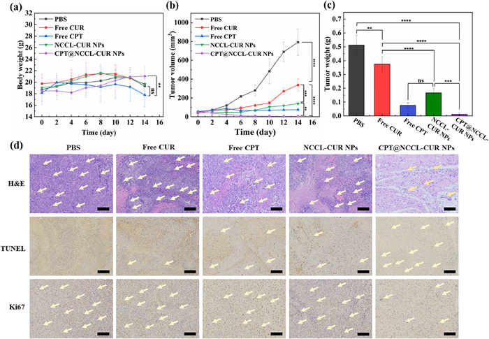 Figure 4.  Anti-tumor efficacy in vivo. (a) Changes in mice body weight and (b) tumor volume during treatment. (c) The average weight of tumors in different groups after treatment on day 14. (d) H&E (purple) and IHC analysis: expression of TUNEL (brown) and Ki67 (brown) in tumor slices on the 14th day of treatment. Scale bar: 200 µm. Data are presented as mean ± SD (n = 5). ns > 0.05, **P < 0.01, ***P < 0.001, ****P < 0.0001.