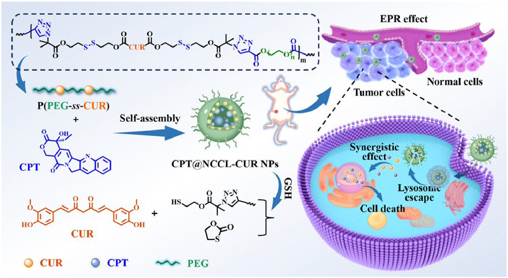 Scheme 1.  Schematic diagram of the preparation of CPT@NCCL-CUR NPs and their endocytosis by tumor cells and triggering drug release in the cancer cytoreductive environment.