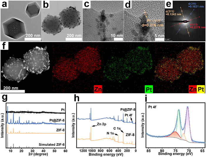 Figure 1  Typical TEM image of (a) ZIF-8, and (b) Pt@ZIF-8. (c) High-resolution TEM image of Pt@ZIF-8 and (d) Pt NPs on ZIF-8. (e) FFT pattern obtained from Pt@ZIF-8. (f) EDS element mapping of Pt@ZIF-8. (g) XRD patterns of Pt@ZIF-8. (h) Survey and (i) Pt 4f of XPS spectra of Pt@ZIF-8.