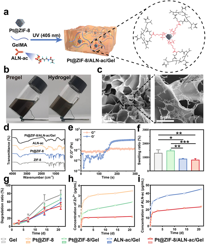Figure 3.  (a) Schematic demonstration of Pt@ZIF-8/ALN-ac/Gel. (b) Photographs of the pregel solution before and after hydrogel transition by UV irradiation. (c) SEM images of Pt@ZIF-8/ALN-ac/Gel. (d) FTIR spectrums of Pt@ZIF-8/ALN-ac/Gel. (e) Rheological testing of Pt@ZIF-8/ALN-ac/Gel. (f) Swelling ratio of Pt@ZIF-8/ALN-ac/Gel. (g) Degradation rates of Pt@ZIF-8/ALN-ac/Gel. (h) Cumulative release of Zn2+ from Pt@ZIF-8/ALN-ac/Gel. (i) Cumulative release of ALN-ac from Pt@ZIF-8/ALN-ac/Gel. All data were shown as means ± SD (n = 3). P < 0.05, **P < 0.01, ***P < 0.001.