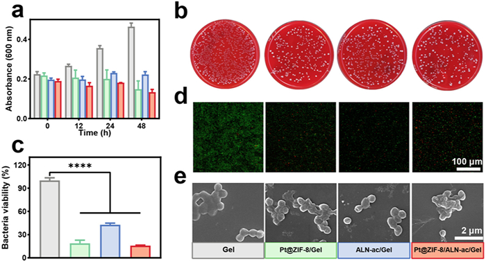 Figure 4  (a) Absorbance of P. gingivalis with 48 h. (b) Images of the P. gingivalis colonies on blood agar plates. (c) Bacterial viability. (d) Live/dead staining (live bacteria were green, dead bacteria were red). (e) Morphology of P. gingivalis at 12 h. All data were shown as means ± SD (n = 3). ****P < 0.0001.