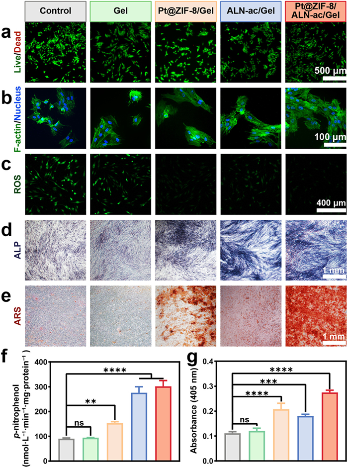 Figure 5  (a) Live/dead staining of hPDLSCs on 1 d (living cells were green and dead cells were red). (b) Morphology of hPDLSCs on 1 d (cytoskeleton were green and nuclei were blue). (c) Intracellular ROS-scavenging performance of Pt@ZIF-8/ALN-ac/Gel. (d) ALP staining of hPDLSCs on 14 d. (e) ARS staining of hPDLSCs on 21 d. (f) ALP activity of hPDLSCs on 14 d. (g) Quantification of extracellular matrix mineralization on 21 d. All data were shown as means ± SD (n = 3). **P < 0.01, ***P < 0.001, ****P < 0.0001. ns, no significant.