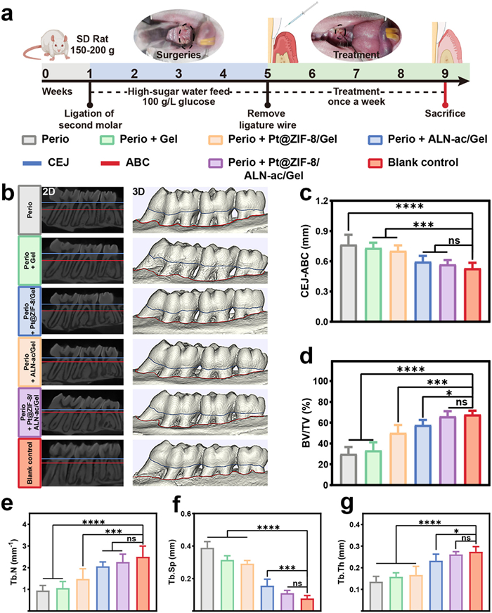 Figure 6  (a) Schematic experimental schedule of ligature-induced periodontitis model in rat and treatment with Pt@ZIF-8/ALN-ac/Gel. (b) Micro-CT scanning and 3D reconstructed image of the maxillary molars with different treatments by Micro-CT (blue lines represent the CEJ and red lines represent the ABC). (c) Quantitative analysis of the distance between CEJ and ABC. The quantitative analysis of bone-related parameters: (d) BV/TV, (e) Tb.N, (f) Tb.Sp and (g) Tb.Th from the Micro-CT images. All data were shown as means ± SD (n = 3). P < 0.05, ***P < 0.001, ****P < 0.0001.
