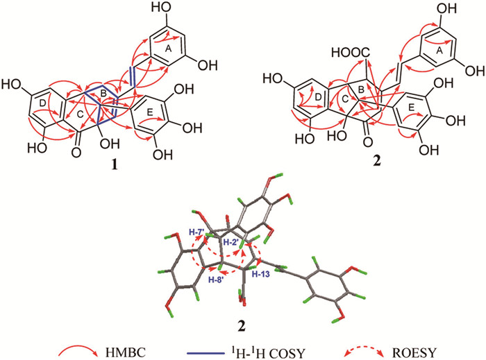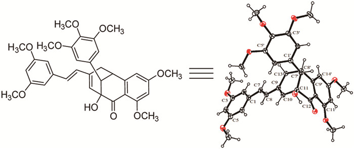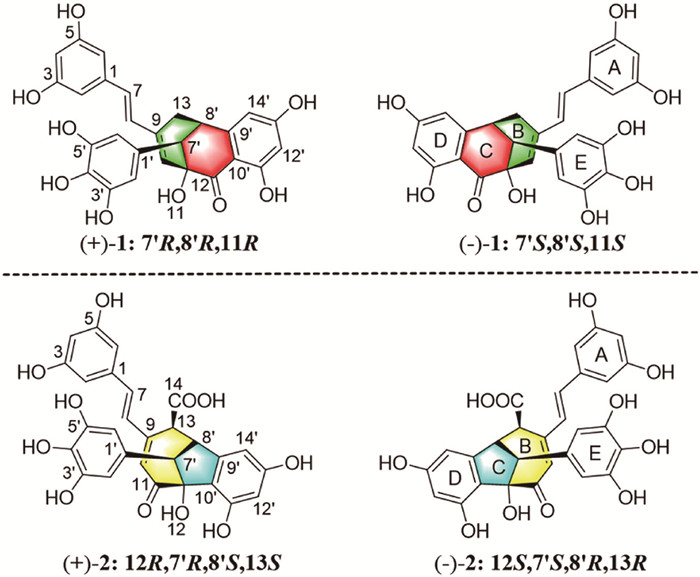 • Stilbenoids, an important class of naturally-occurring polyphenolic compounds already found in various plant families, are specialized secondary metabolites that act as phytoalexins in plants [1-3]. To date, approximately 459 natural stilbenoid compounds with diverse scaffolds have been identified and have been proven to exhibit cardioprotective, neuroprotective, anti-diabetes, antiobesity, depigmentation, anti-inflammatory and cancer prevention activities [4-8]. Among them, approximately 65 stilbenoid dimers with various structural patterns including cyclobutane, indane, dihydrofuran, dihydrobenzofuran, 1,4-benzodioxane ring, cyclohexene ring, cycloheptene-1-one, bicyclic [3.2.1], [3.2.2], [3.3.0] and [4.2.0] moieties, have been identified [9-17], with most of them based on resveratrol. The intriguing structural complexity and often relatively high bioactivities of dimeric stilbenoids have incentivized sustaining attentions from the scientific community [18-21].