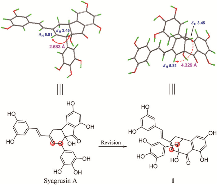 When reviewing the reported literature, we found that 1 had the same molecular weight, 1H and 13C NMR data (detected in CD3OD) as those of syagrusin A ([α]D25+57(c1.00,MeOH)) from Syagrus romanzoffiana, which was described as a 1,4,4a,9a-tetrahydrofluoren-9-one core skeleton in 2010 (Fig. 3) and has been continuously cited in recent years [4,28-32]. This finding encouraged us to re-evaluate the structure of syagrusin A. Although the 2D NMR spectra (HSQC, HMBC and 1H–1H COSY) supported both the planar structures of syagrusin A and 1, detailed analysis of the ROESY spectrum revealed an obvious discrepancy with the reported structure. As shown in Fig. 3, strong nuclear Overhauser effect (NOE) correlations between the two protons at δH 5.81 and 3.45 in syagrusin A should be observed because of their adjacent spatial proximity, which, however, does not correlate at all in the ROESY spectrum. This “negative correlation” conflicts with the assignment of syagrusin A but does support the structure of 1.