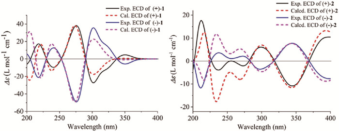 Figure 5  Experimental and calculated ECD spectra of (+)−1 and (−)−1, (+)−2 and (−)−2, respectively.