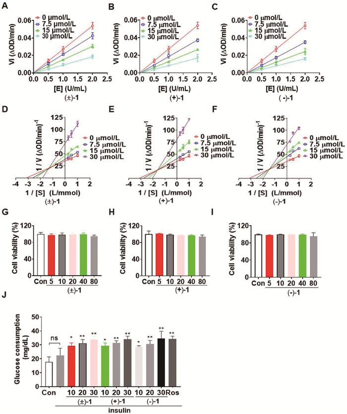 Figure 6.  Kinetic assessment of the effects of compounds (±)−1, (+)−1 and (−)−1 against PTP1B and their effects on glucose consumption in HepG2 cells. (A–C) Enzyme kinetics curve (n = 3). (D–F) Substrate kinetics study. Lineweaver-Burk plot of PTP1B activity at various substrate concentrations with various compounds (n = 3). (G–I) HepG2 cells were treated with 5, 10, 20, 40, and 80 µmol/L of compounds for 24 h. Cell viability was measured with a cell counting kit-8 (CCK-8) assay (n = 6). (J) Cellular glucose consumption was detected in insulin (10 nmol/L)-stimulated HepG2 cells after 24 h of treatment with 10, 20 and 30 µmol/L of compounds, and 10 µmol/L of rosiglitazone (ROS) was used as a positive control (n = 6). The data are expressed as the mean ± SD. P < 0.05, **P < 0.01 vs. the insulin treatment group. ns, no significance.