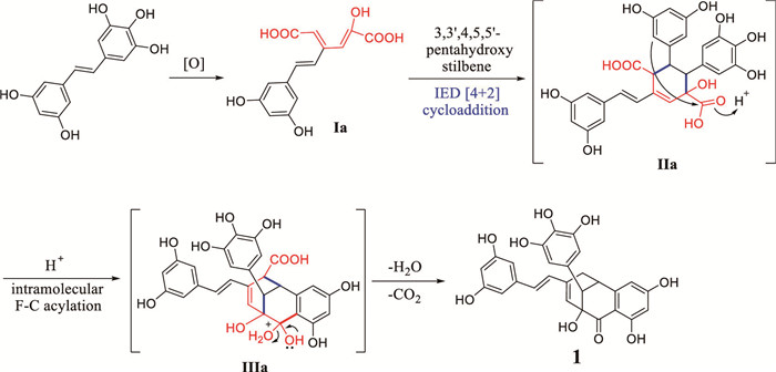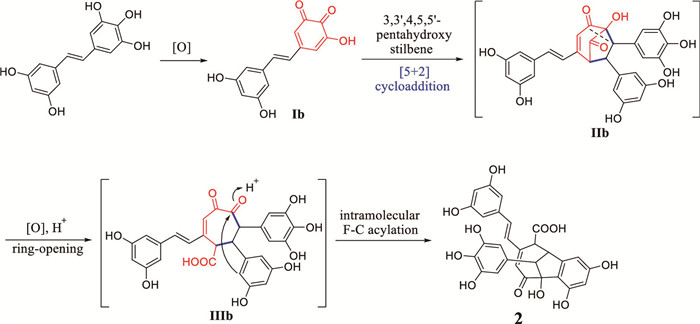 Biogenetically, we propose that 2 is also derived from the monomer 3,3′,4,5,5′-pentahydroxy stilbene. First, ring A in pentahydroxy stilbene is oxidated to obtain the electron-deficient o-quinone (Ib), which then undergoes a [5 + 2] cycloaddition reaction with another pentahydroxy stilbene to provide IIb with a [3.2.1] scaffold [38]. After that, ring-opening by oxidation followed by intramolecular Friedel-Crafts acylation finally led to the formation of 2 (Scheme 2) [39].