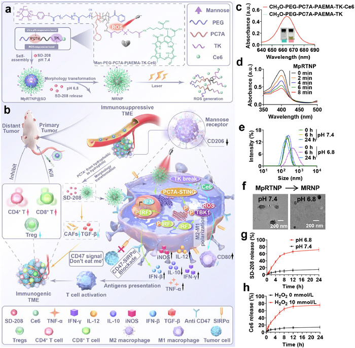 Herein, we constructed a mannose-modified pH and ROS sequential-gated transformable chlorin e6 (Ce6) nanoprodrug (MpRTNP) loaded with SD-208 (MpRTNP@SD) (Fig. 1a). In the weakly acidic TME (pH 6.8), the hydrophobic block PC7A transformed into hydrophilic PC7A+, causing MpRTNP to reassemble into the mannose-modified ROS-responsive nanoprodrug (MRNP) with concurrent SD-208 release. SD-208 blocked the TGF-β signaling axis in the TME, decreased CAFs and Tregs, and recruited T lymphocytes with tumor infiltration, while MRNP actively targeted TAMs via mannose receptor-mediated endocytosis. After laser irradiation, substantial ROS were generated, resulting in thioketal (TK) linker breakage and Ce6 release. The ROS subsequently polarized TAM into M1 phenotype, and PC7A in the polymer skeleton served as a STING agonist to activate the innate immunity (Fig. 1b). The in vivo near-infrared imaging results revealed enhanced tumor accumulation of MpRTNP, enabling early diagnosis via magnetic resonance imaging (MRI) after coordination with gadolinium (Gd3+). In vivo results revealed that MpRTNP remodeled the TME and inhibited the primary and distant tumors growth. After combination with anti-CD47, mouse survival time was significantly prolonged. This study thus presents a novel strategy for the rational design of a smart nanoplatform aimed at enhancing antitumor immunotherapy via the spatiotemporal regulation of the TME.